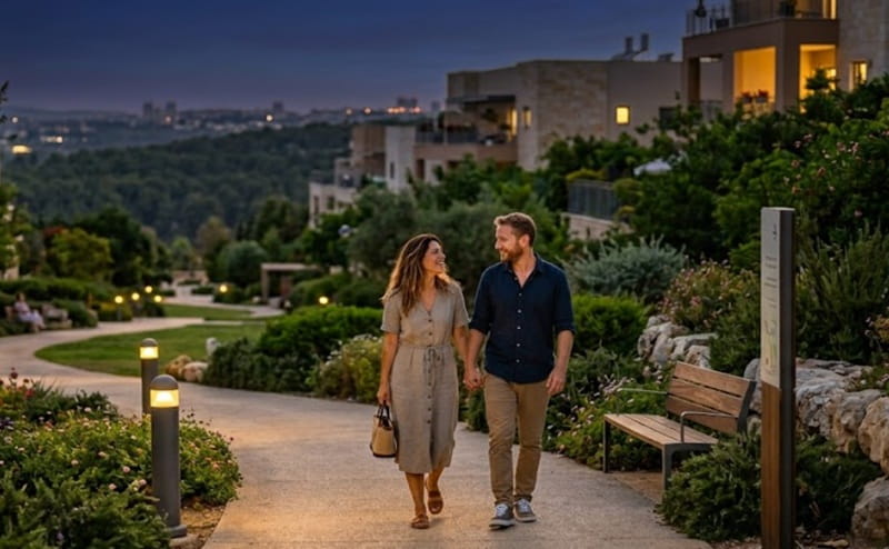 תכנון חכם: שבילים שמזמינים הליכה יד ביד בלי רעש של מכוניות.